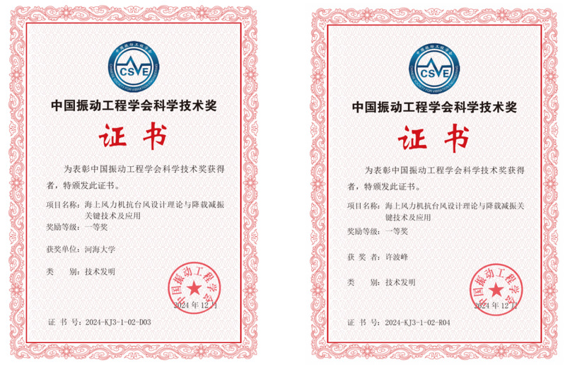 12月5-8日,第十六届全国振动理论及应用学术会议在湖南长沙成功召开,会议期间举行了中国振动工程学会2024年度科学技术奖颁奖仪式。yl23411永利官网风能与系统系许波峰副教授合作的项目成果《海上风力机抗台风设计理论与降载减振关键技术及应用》获中国振动工程学会技术发明奖一等奖,这是我校在风能利用研究领域的又一项重要突破。其他完成人包括南京航空航天大学柯世堂教授、王珑副教授、任贺贺副教授,以及香港理工大学朱松晔教授和广东院刘东华教授级高级工程师。